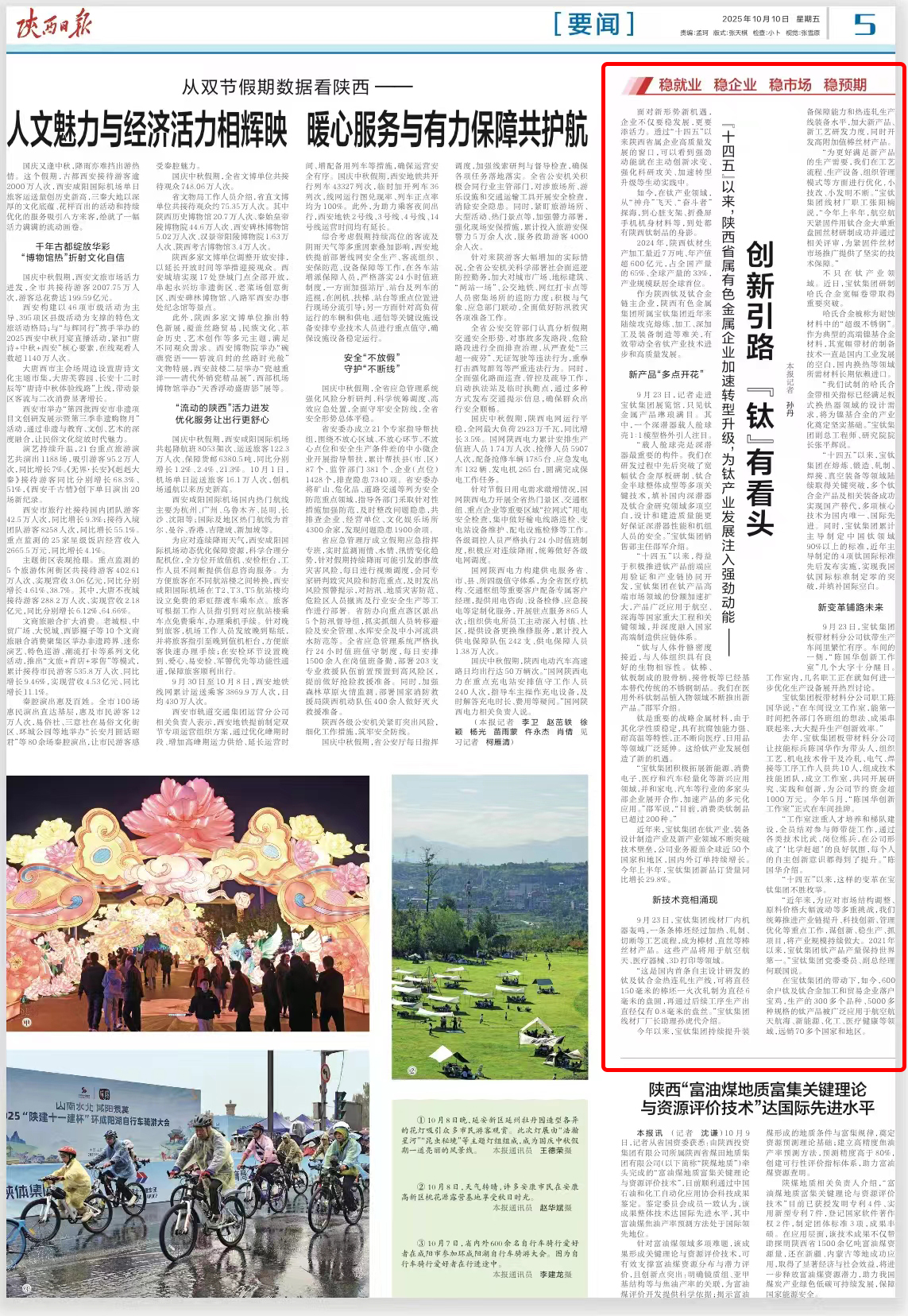 如今,在钛产业领域,从“神舟”飞天、“奋斗者”探海,到心脏支架、折叠屏手机机身材料等,到处都有陕西钛制品的身影。