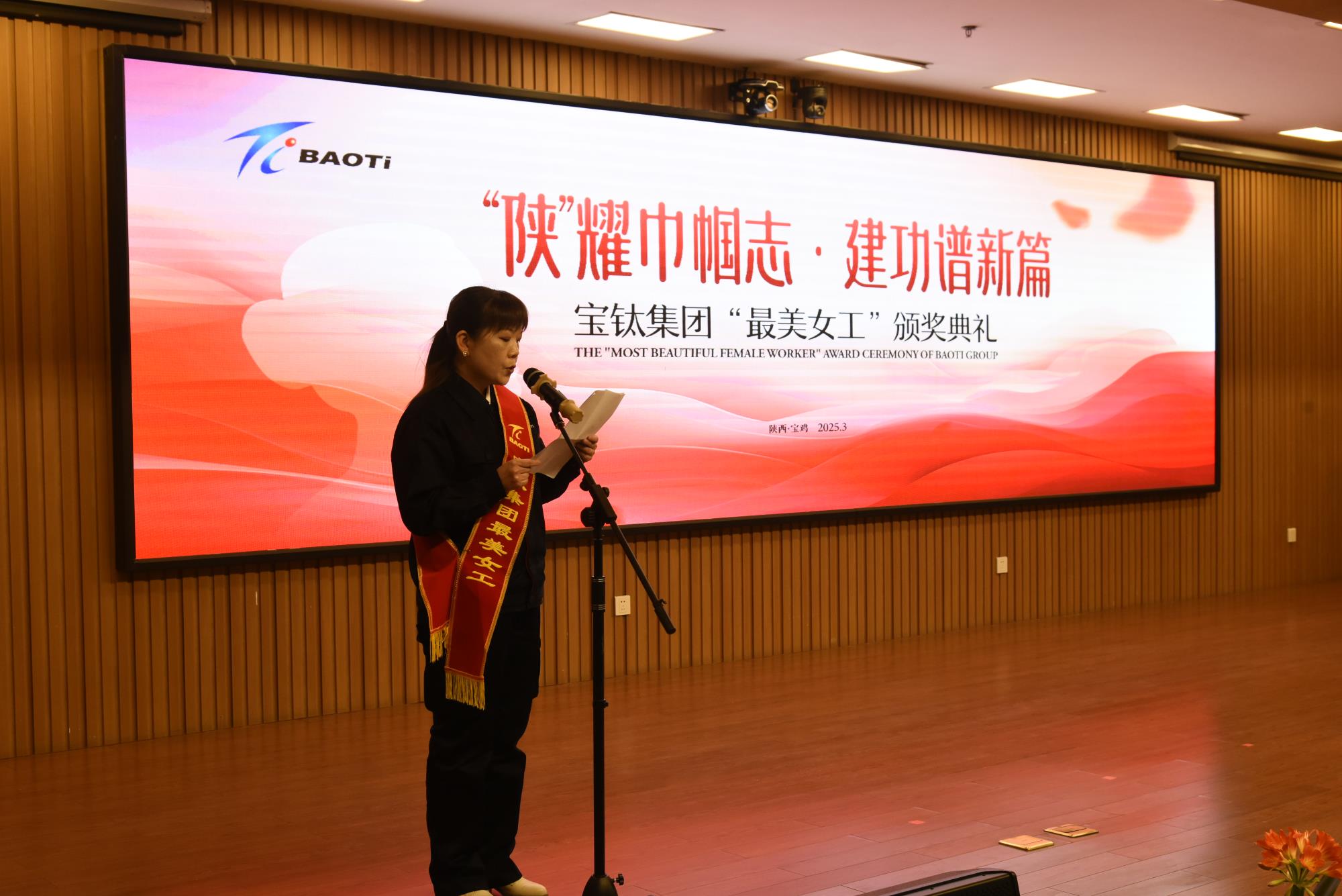 3月12日下午,由宝钛集团工会女职委精心策划组织,以 “‘陕’耀巾帼志 建功谱新篇”为主题的宝钛集团“最美女工”颁奖典礼在宝钛宾馆七楼学术报告厅盛大举行。宝钛集团党委副书记、工会主席贺治民出席活动并为“最美女工”颁奖。宝钛集团工会副主席田周平宣读表彰决定。宝钛集团工会女职委副主任、女工部部长杜薇华致辞。