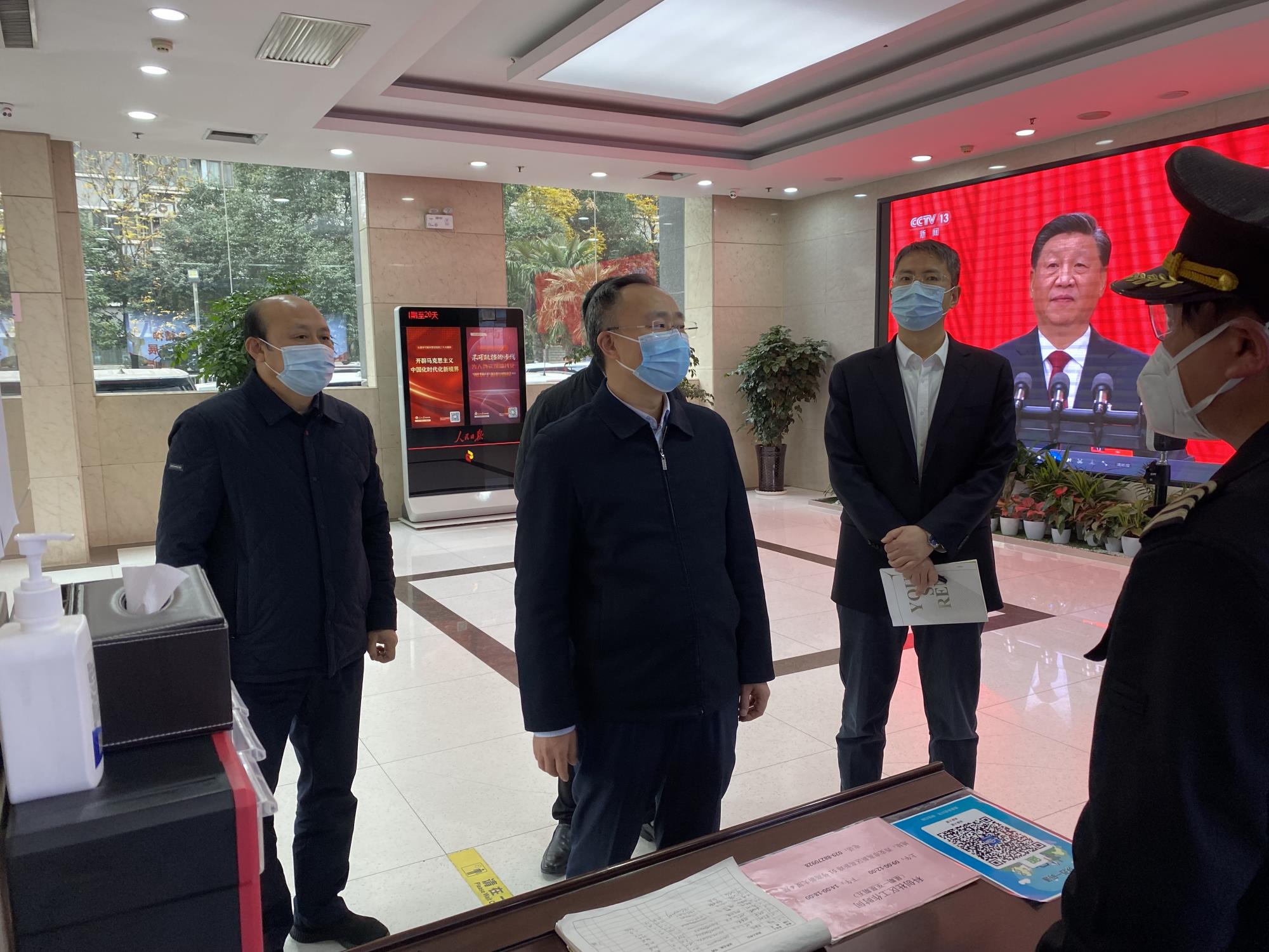 检查组首先来到大厦一楼,详细了解门禁管控措施落实情况。黄忠良指出,要完整准确全面贯彻落实习近平总书记关于疫情防控工作重要讲话重要指示精神和党中央决策部署,认真贯彻执行省委省政府工作要求,坚持第九版防控方案、落实二十条优化措施。要进一步夯实“四方”责任,不断优化防控措施,坚决履行防控主体责任,认真落实各项常态化疫情防控举措,进入大厦必须扫码、测温,核对健康码、行程码和核酸检测阴性结果,仔细进行出入登记,确保大楼安全、人员安全。