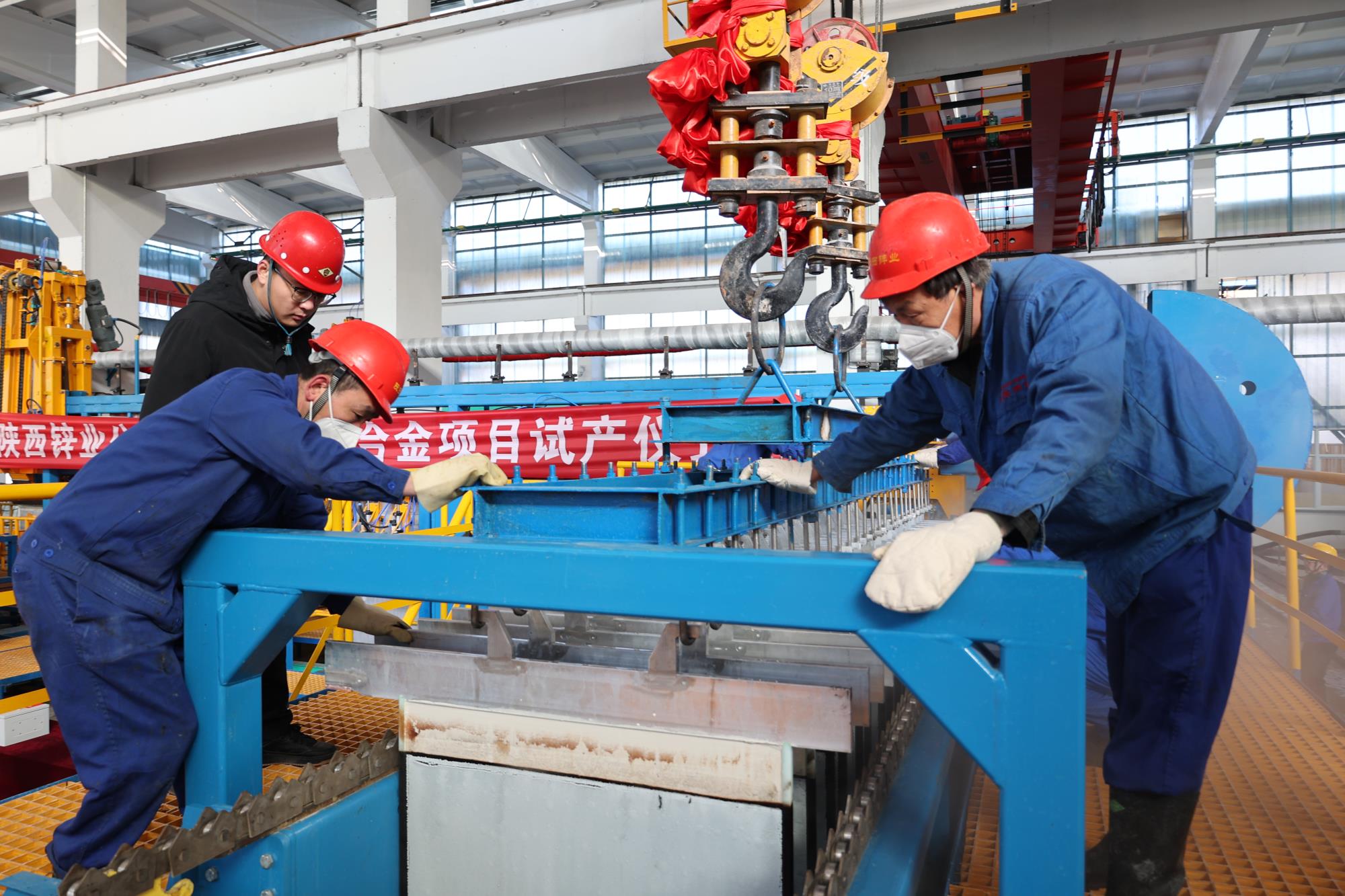龙腾虎跃辞旧岁,银蛇舞动迎新春!2025年元月1日,陕西锌业公司8万吨锌基合金项目试生产仪式隆重举行,随着公司党委副书记、总经理徐靖一声令下,“陕西锌业公司8万吨锌基合金生产线试生产开始┈┈”,第一吊锌片顺利出槽,在行车的牵引下缓缓移向自动剥锌机,产出合格产品,标志着项目正式进入试产阶段,参与项目建设的20余家单位齐聚试产现场,共同见证这一伟大历史时刻。