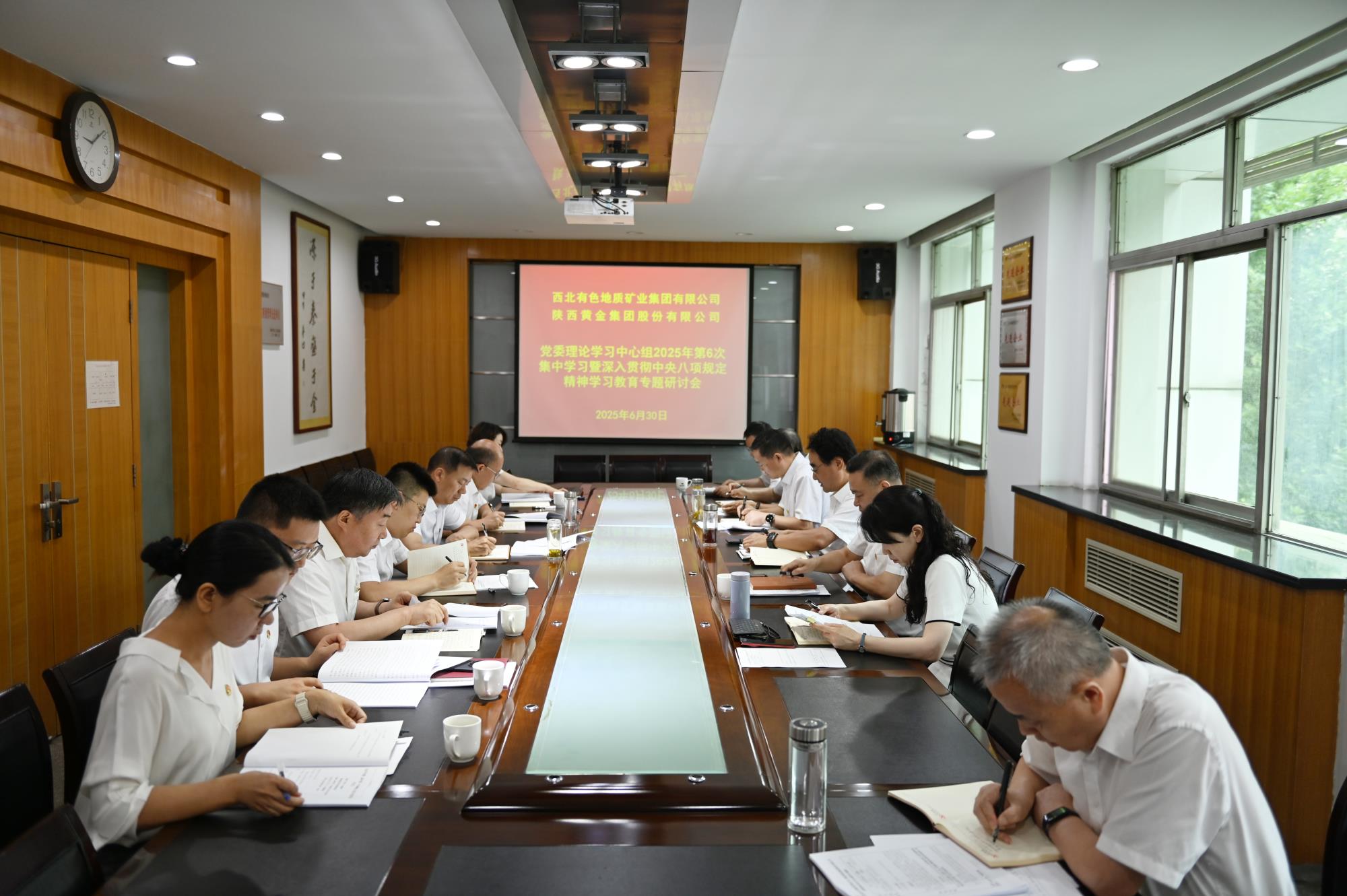 6月30日,地矿集团党委、黄金集团党委理论学习中心组举行2025年第六次集体学习暨深入贯彻中央八项规定精神学习教育专题研讨会议,集中学习习近平总书记关于锲而不舍落实中央八项规定精神的有关重要论述、《党的十八大以来深入贯彻中央八项规定精神的成效和经验》、《八项规定改变中国》、《党政机关厉行节约反对浪费条例》、党员干部严禁参与的20类违规吃喝情形等内容。两集团党委书记、董事长秦西社主持会议并带头发言,领导班子成员逐一交流研讨。