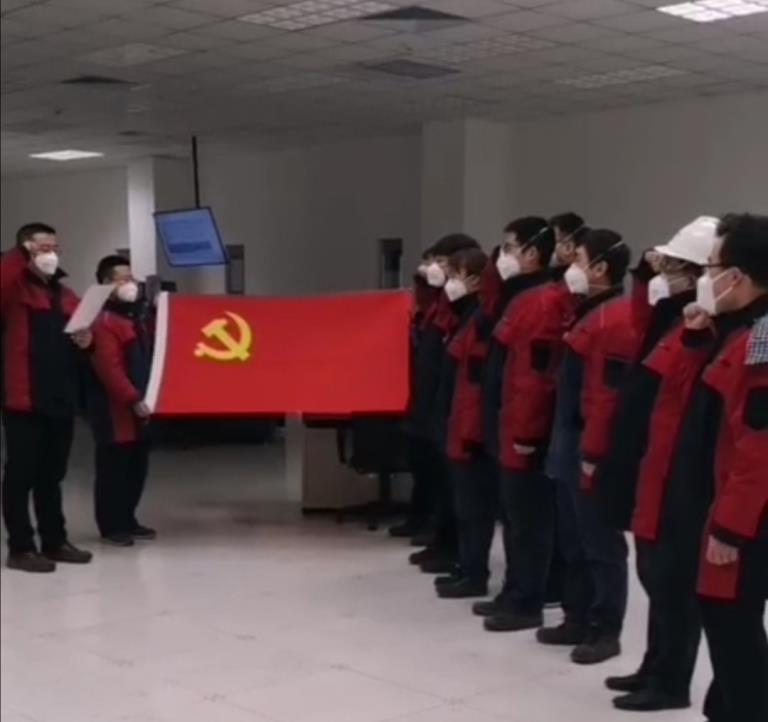 “我志愿加入中国共产党……随时准备为党和人民牺牲一切……”尽管大家都带着口罩,但声音依旧洪亮、热情高涨。随后,大家向疫情宣战,喊出了战“疫”宣言:“我志愿坚守疫情防控第一线,一切行动听指挥。坚定信心,科学防控;不畏艰险,团结协作;勇于担当,决不迟疑。哪里有需要,我就到哪里去。用忠诚和奉献保生产、保安全!