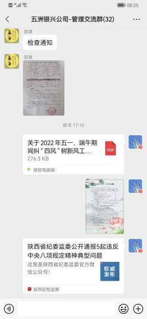 节前有部署。一是结合陕西银矿实际,及时印发《关于做好五一端午期间纠治“四风”工作的通知》,对节日期间纠治“四风”工作进行合理安排部署。二是通过公司官网、微信公众号、工作群等网络媒介,做好廉洁提醒宣传,畅通举报渠道,通报违反中央八项规定精神典型案例,筑牢党员干部作风防线,严防死守杜绝“节日腐败”。三是对公司资产财务部、党群工作部、办公室等重要部室负责人进行节前廉洁提醒,要求严格履行岗位职责,认真贯彻执行中央八项规定精神,严禁节假日期间违规收送礼品和宴请、违规使用公款吃喝旅游、公车私用等违规违纪行为的发生,时刻注意言行举止,树立良好的党员干部形象。严格落实疫情防控各项措施,切实做好疫情防控工作,全方位做好节日期间纠治"四风"工作。